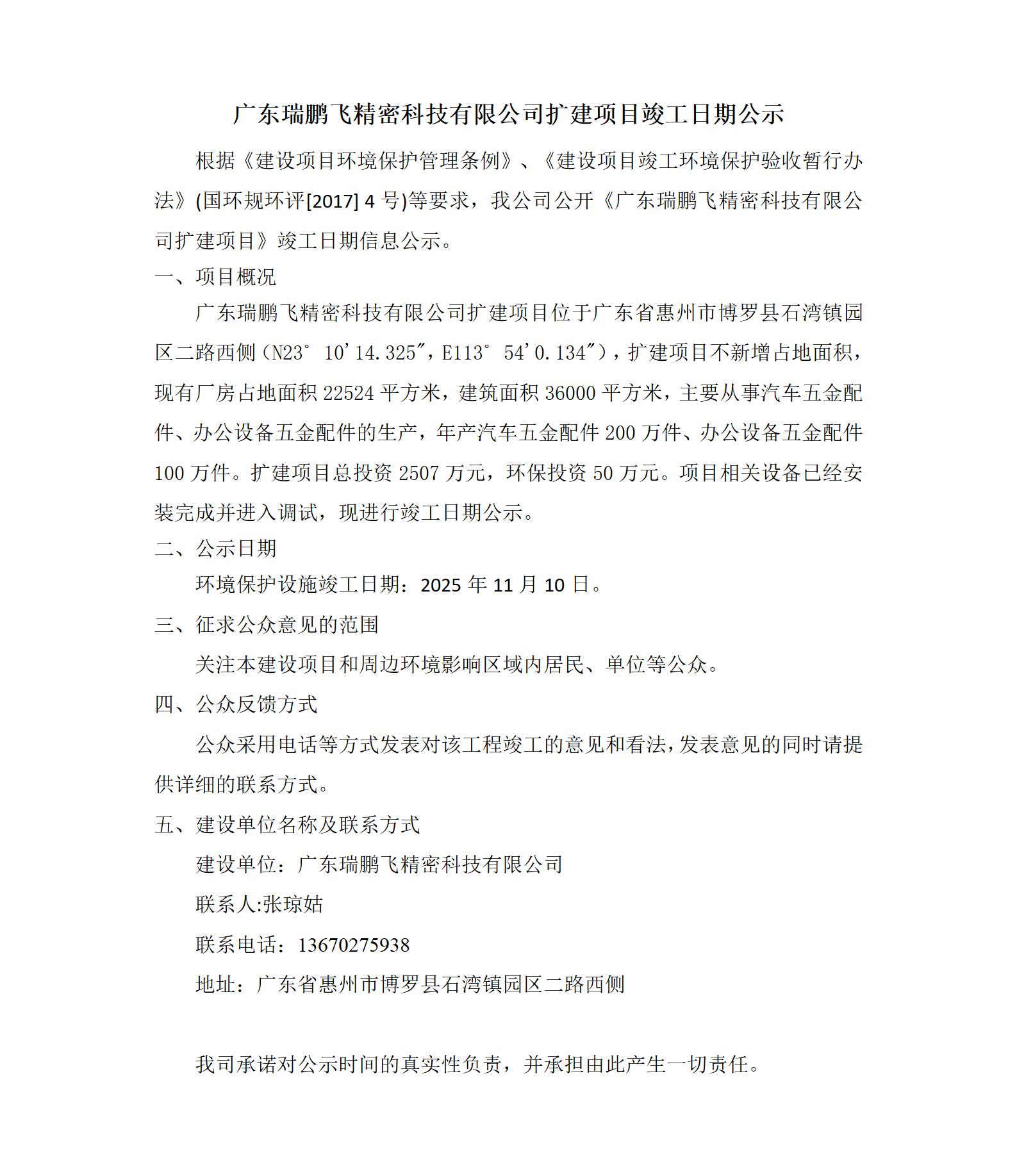 广东瑞鹏飞精密科技有限公司扩建项目竣工日期公示