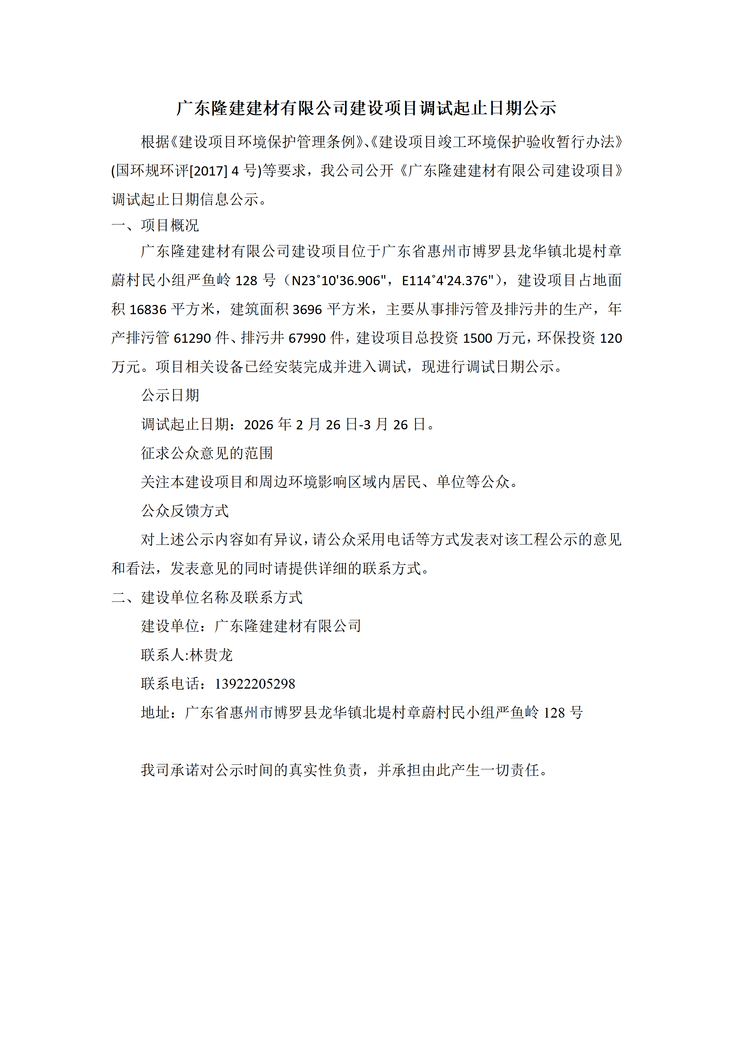 广东隆建建材有限公司建设项目调试起止日期公示